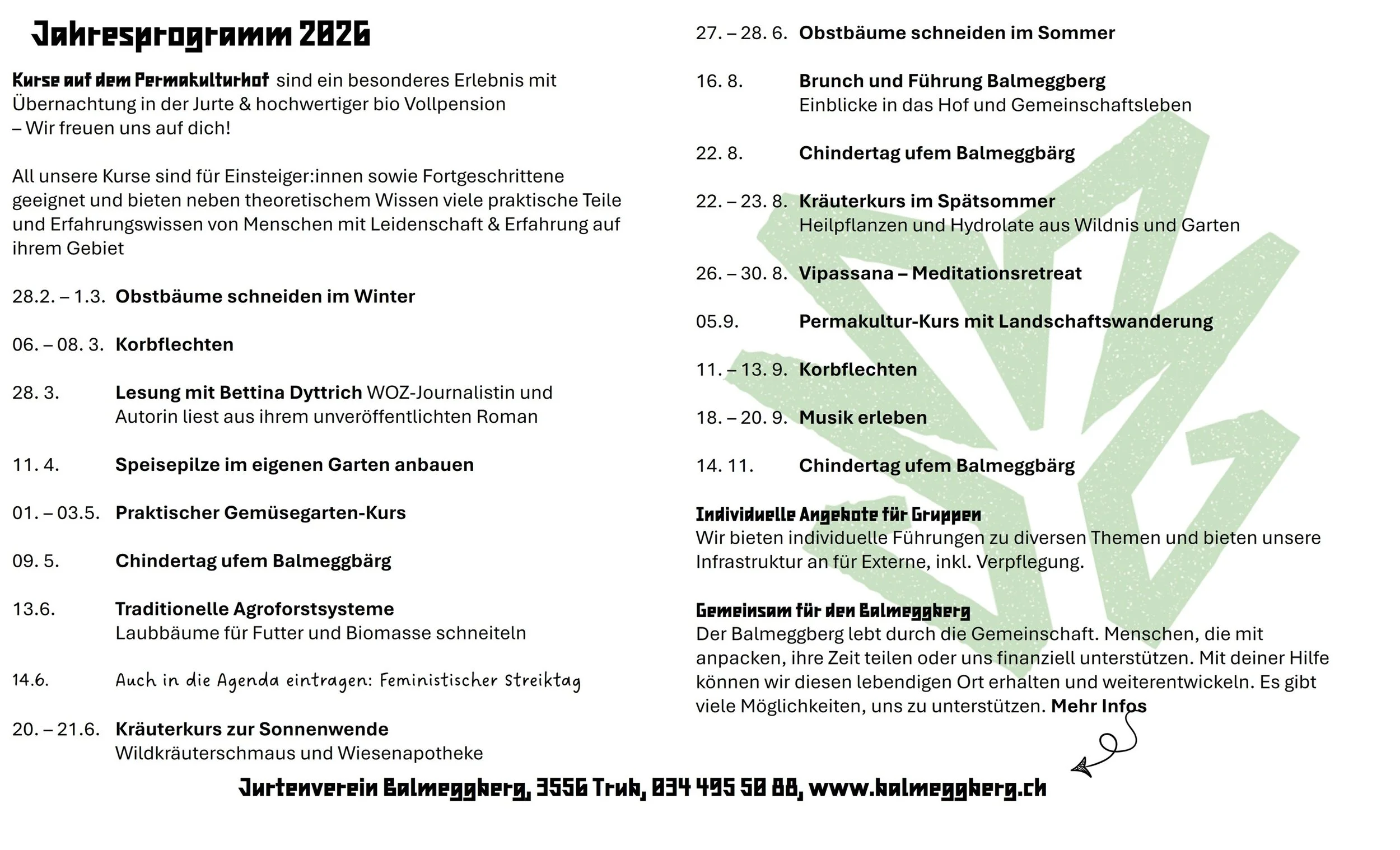 Tadaaaa…hier ist unser frischgedrucktes Jahresprogramm mit dem abwechslungsreichen Kursangebot für 2026. Schau am Besten gleich rein unter der Rubrik “Kurse” hier auf der Webseite. Mund zu Mund Werbung hilft uns am besten, interessierte Menschen für unsere Kurse zu gewinnen. Möchtest du einen Flyer an deinen Kühlschrank hängen oder irgendwo an ein schwarzes Brett pinnen? Melde dich wir schicken dir gerne einen zu oder teile ihn ganz modern via soziale Medien. :)